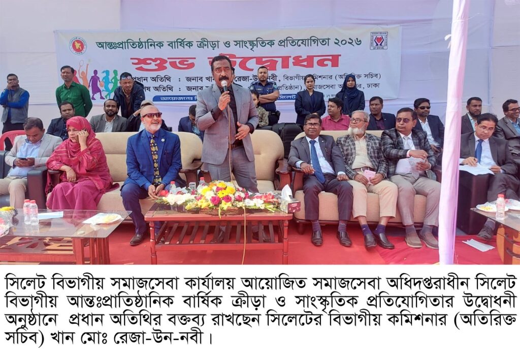 সিলেটের বিভাগীয় কমিশনার খান মো: রেজা—ঊন—নবী বলেছেন,সমাজসেবা অধিদপ্তরাধিন প্রতিষ্ঠান গুলো অঙ্গীকার নিয়ে কাজ করছে। সমাজের পিছিয়ে পড়া, সুবিধা বঞ্চিত শিশুদের মানুষ হিসেবে গড়ে ঊঠার জন্য কর্মকর্তা কর্মচারিরা অভিভাবক হিসেবে পেশাদারিত্বের সাথে দায়িত্ব পালন করছে। আত্ম মর্যাদাশীল মানুষ হিসেবে নিবাসীদের মাথা ঊচু করে দাঁড়াতে নিজেদের তৈরী করার আহ্বান জানান। তিনি ১৭ জানুয়ারি শনিবার সকাল সাড়ে ৯টায় সিলেট নগরির বাগ বাড়িস্থ শিশু পরিবার মঠে বিভাগীয় সমাজসেবা কার্যালয় আয়োজিত সমাজসেবা অধিদপ্তরাধিন আন্ত: প্রাতিষ্ঠানিক সিলেট বিভাগীয় বার্ষিক ক্রীড়া ও সাংস্কৃতিক প্রতিযোগিতার ঊদ্বোধনী অনুষ্ঠানে প্রধান অতিথির বক্তব্যে একথা বলেন।